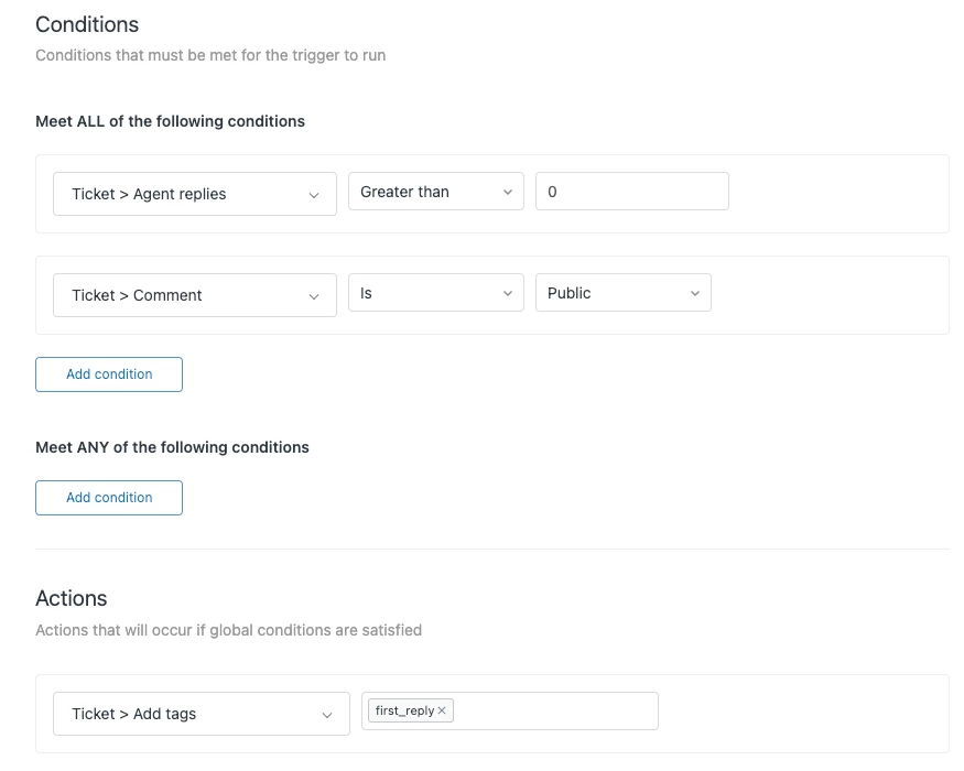 (Part 1) Trigger: all tickets with a public reply have the "first_reply" tag added to it.