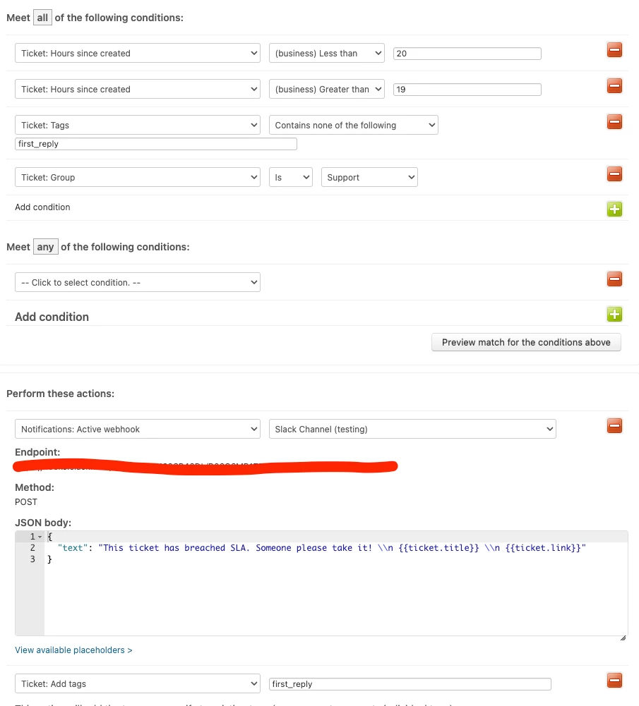 (Part 2) Automation: ticket is older than 19 hours but less than 20 hours. Doesn't have the "first_reply" tag. Action is to send a webhook message out to Slack as SLA warning. Adds "first_reply" tag as a nullifier so that there isn't an endless loop.
