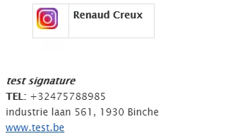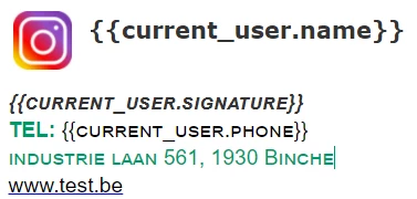 <div id="content" style="width: 250; font-family: Arial, sans-serif; font-size: 11px; font-variant: small-caps; margin-left: 2px; margin-top: 5px;"><span style="font-weight: bold; font-style: italic; color: #333333;">{{current_user.signature}}</span><br /><span style="font-weight: bold; font-size: 11px; color: #009966;">TEL:</span> {{current_user.phone}} <br /><span style="font-size: 11px; color: #009966;">Leuvensesteenweg 561, 1930 Zaventem</span><br /><a href="http://www.facq.be" target="_blank"><span style="color: #000000; font-variant: normal;">www.facq.be</span></a></div>