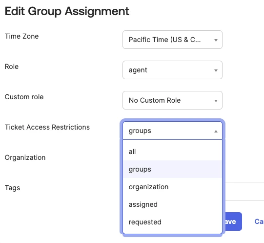 - I am not sure which option to select under "Ticket Access Restrictions" in the "Edit Group Assigment" in Okta. Image below