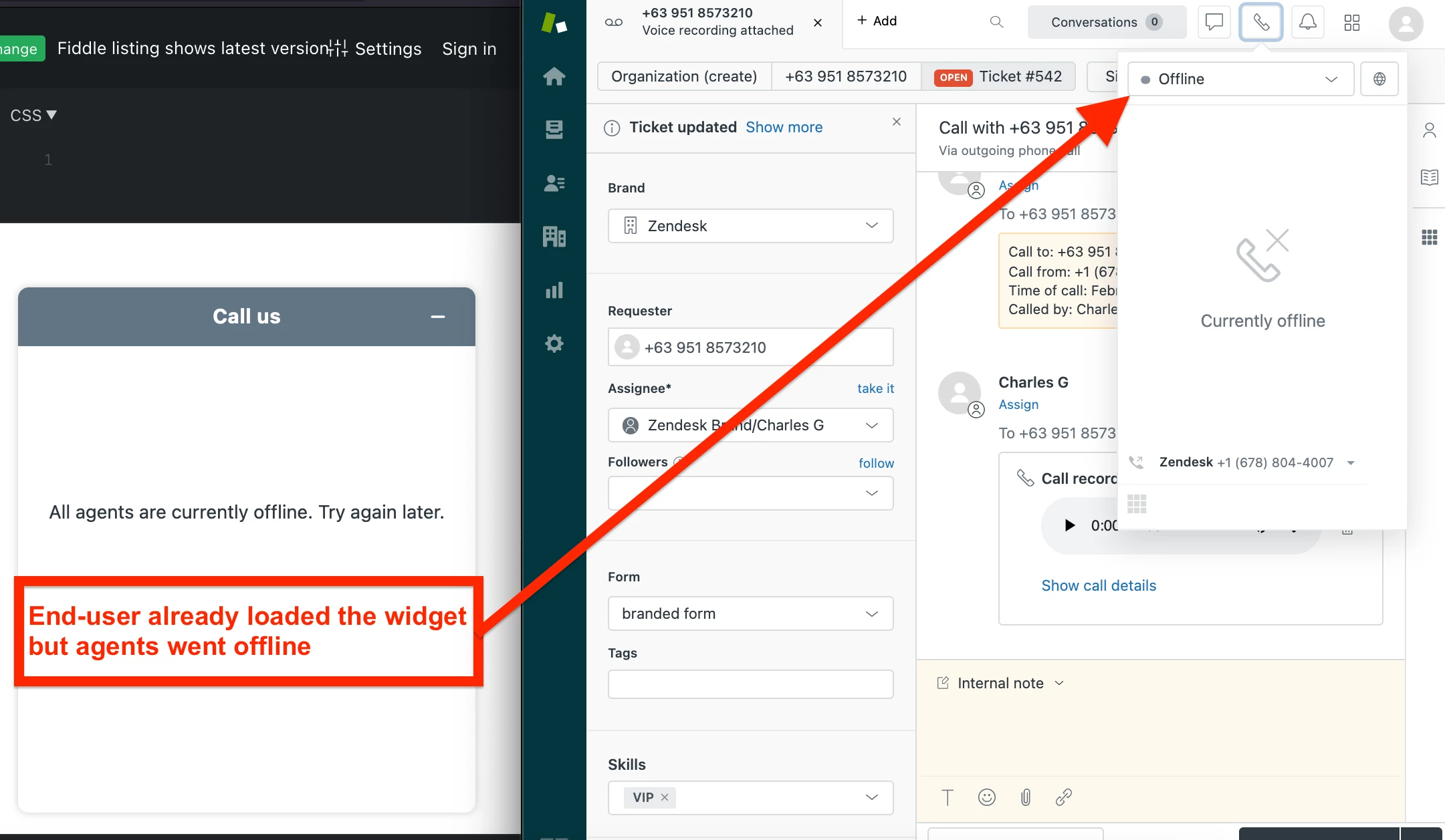 2. It opens and informs the user that there are no agents available to take their call.