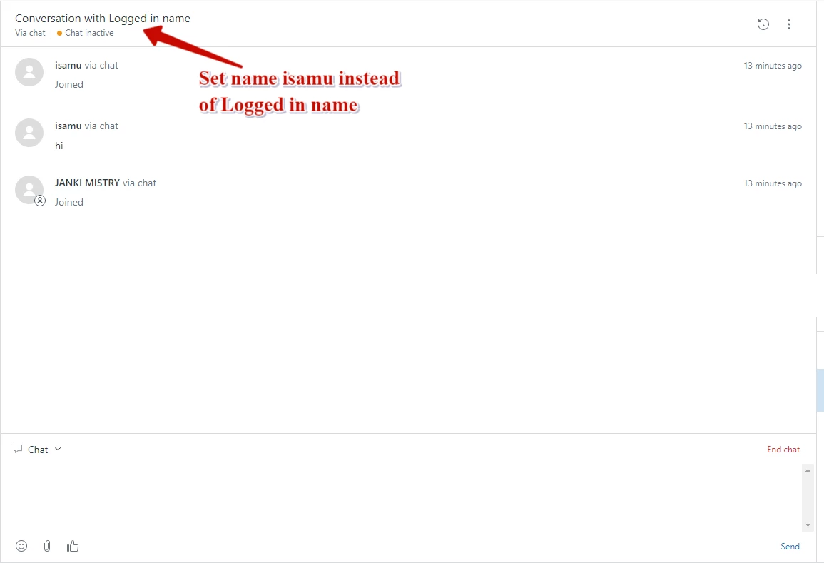 - This code set the name only in the conversation but not set as a conversation header title. And this should be changed through the code or dynamically not manually.