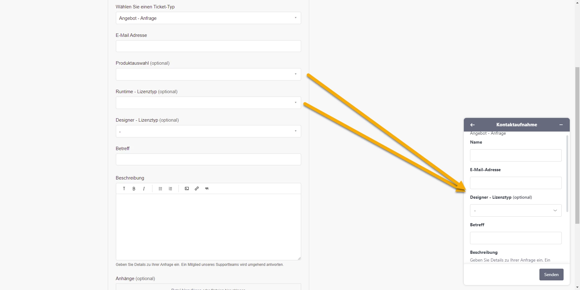 This Ticket Form works fine when I open it inside the GUIDE (left side of the screenshot). But when I open the same Ticket Form in the Web Widget I can only see the 3. custom field "Designer - Lizenztyp" (see right side of the screenshot).
