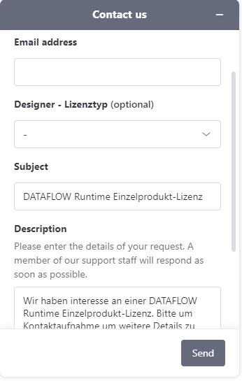 { id: 'description', prefill: { '*': 'Wir haben Interesse an einer DATAFLOW Runtime Einzelprodukt-Lizenz. Bitte um Kontaktaufnahme um weitere Details zu klären' } },