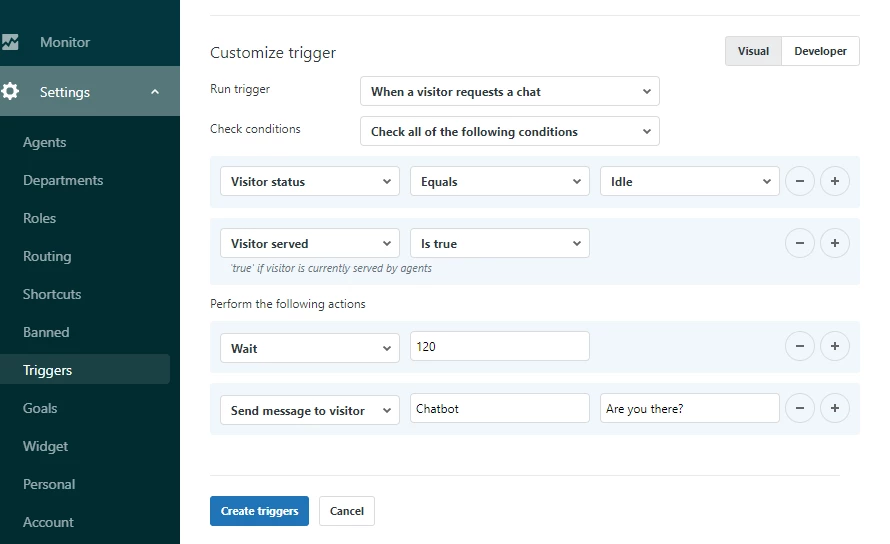 1. Send a message to customer, "Are you there?" if they haven't replied for 2 mins.