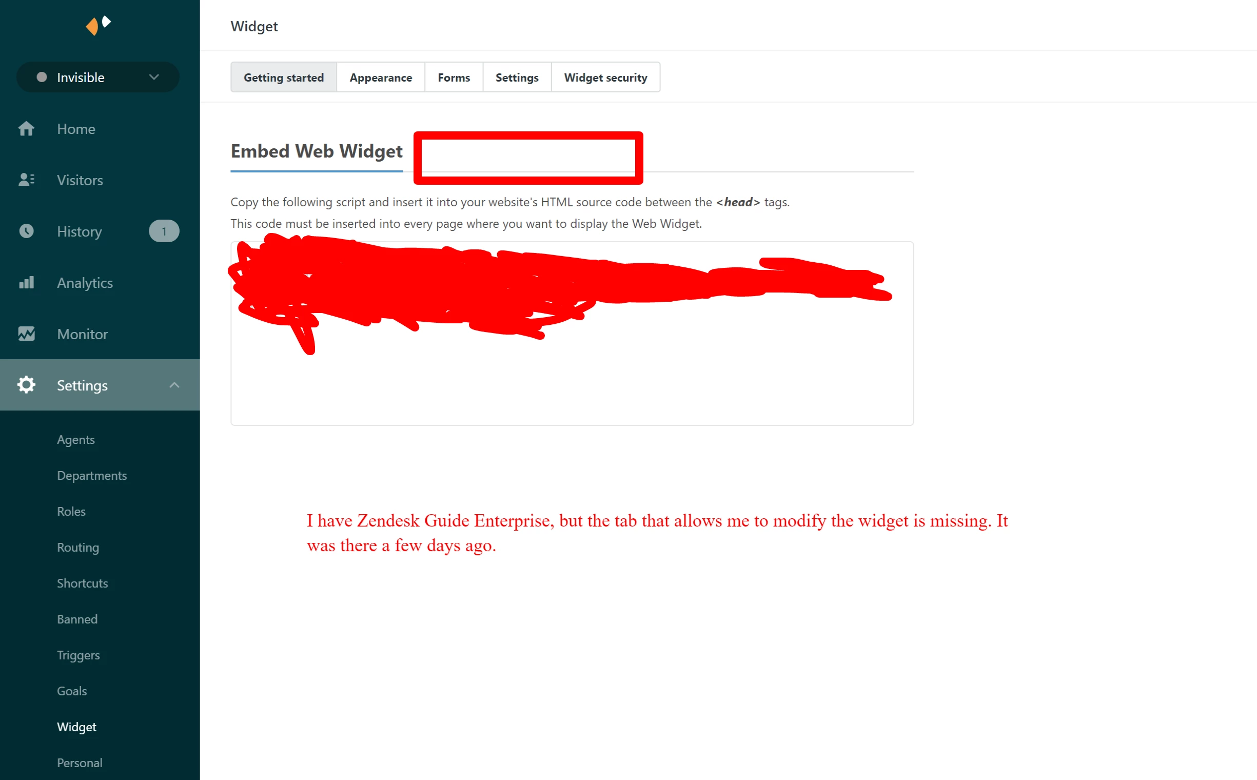 I have Zendesk Guide Enterprise but when I navigate to Chat--> Settings --> Widget, I don't see the option to modify the widget. A few days ago, that option was visible.