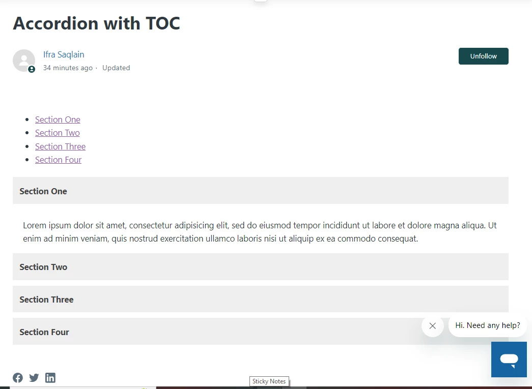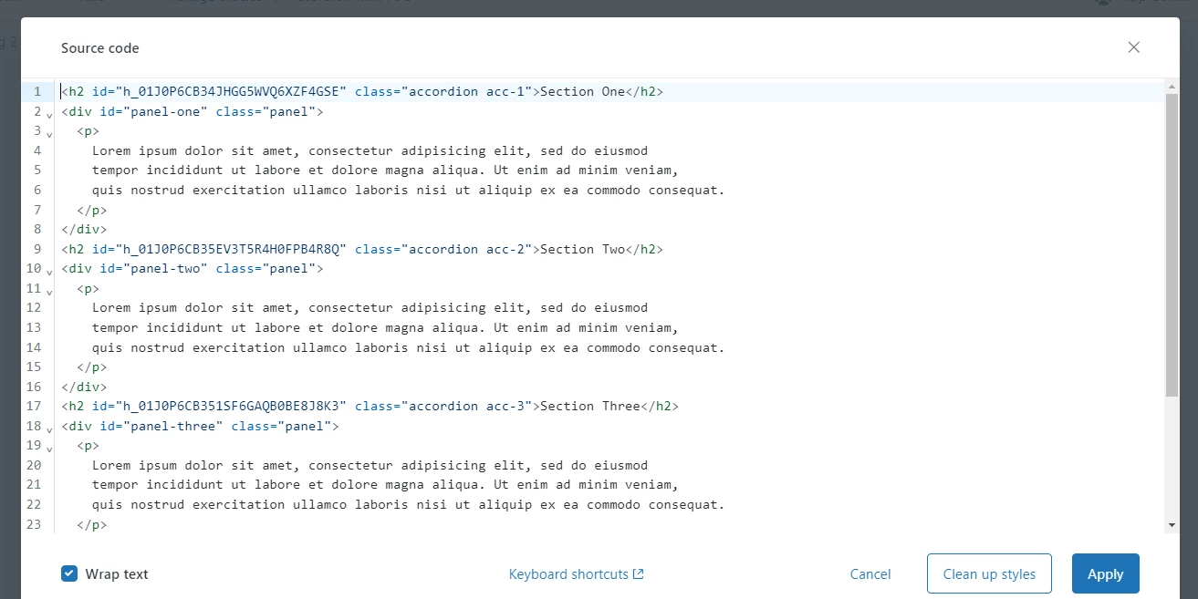 Add HTML code to your ‘Source code’ while creating the article to show accordion functionality on your article page.