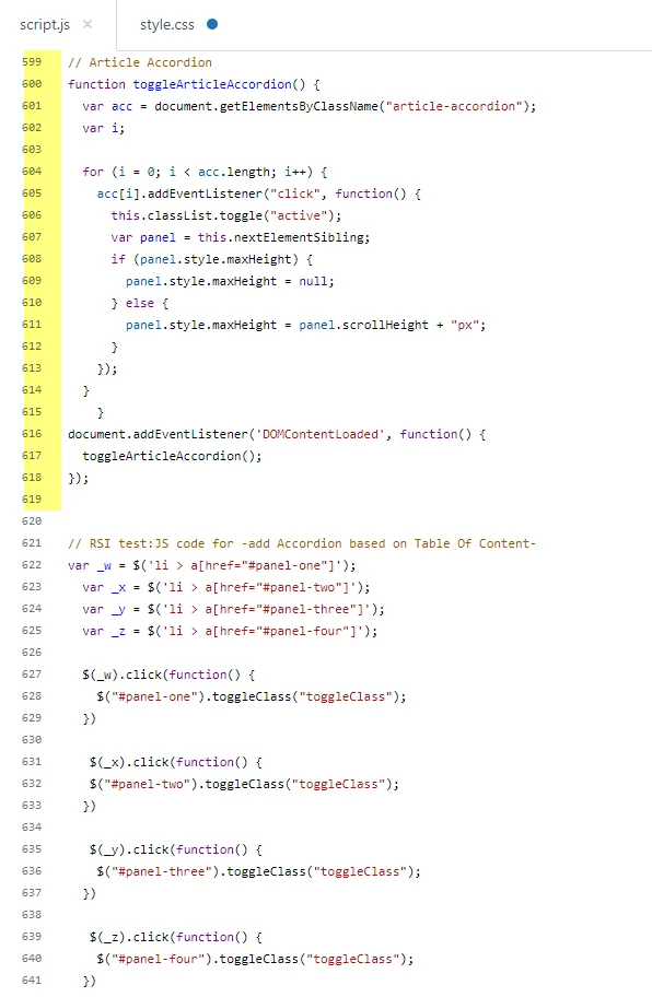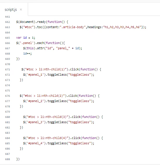 III). Add JS code to your script.js file inside the TOC code block, please see the given screenshot.