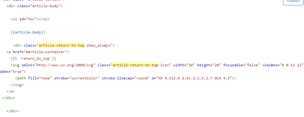 Go to the article_page.hbs file and add this given code just after the {{article.body}}, this code is for ‘return to top’ , you won't need to scroll via mouse, click on it. Please see the given screenshot for the same.