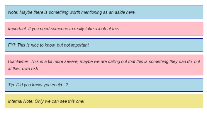In our Zendesk, we use colored notes in articles to help call out important pieces of information. We would manage this by adding classes to blockquotes in order to tell the Help Center to color those blockquotes a certain way. I wanted to try to make this a little easier so my team didn't have to dig into the article source code to make this happen. Below is a screenshot of some of our example comments. These were stylized due to them having a keyword (Note:, Important:, etc) in them.