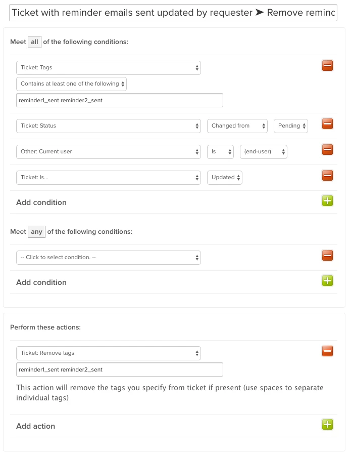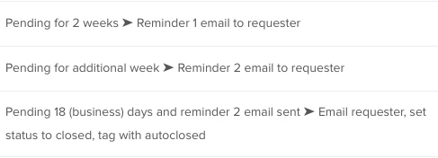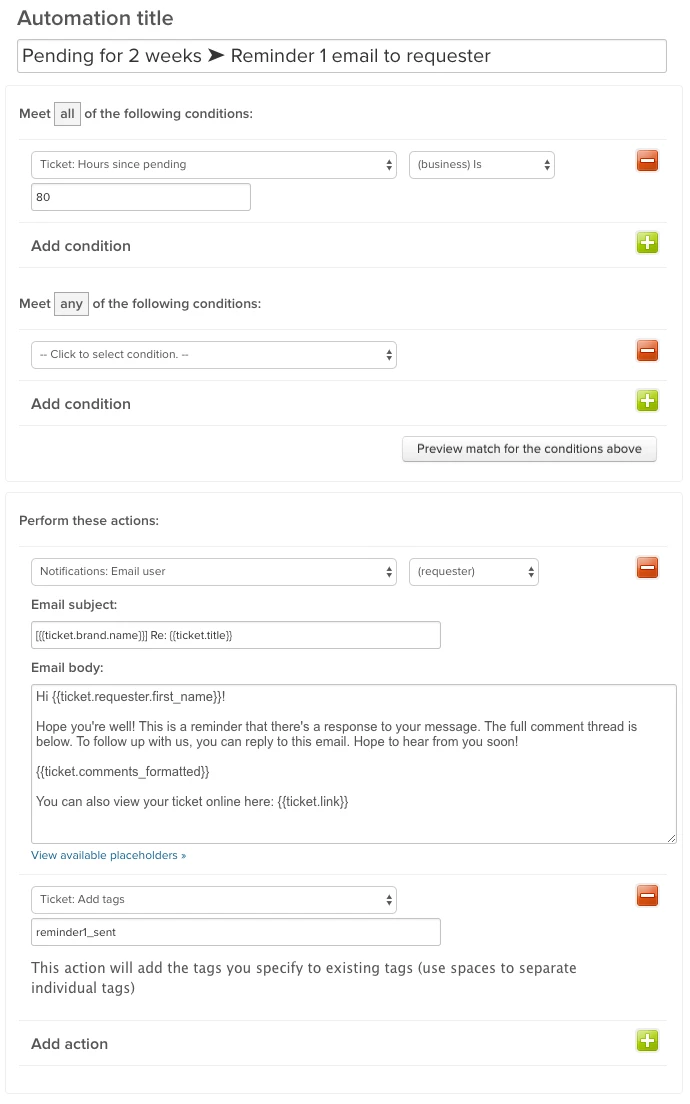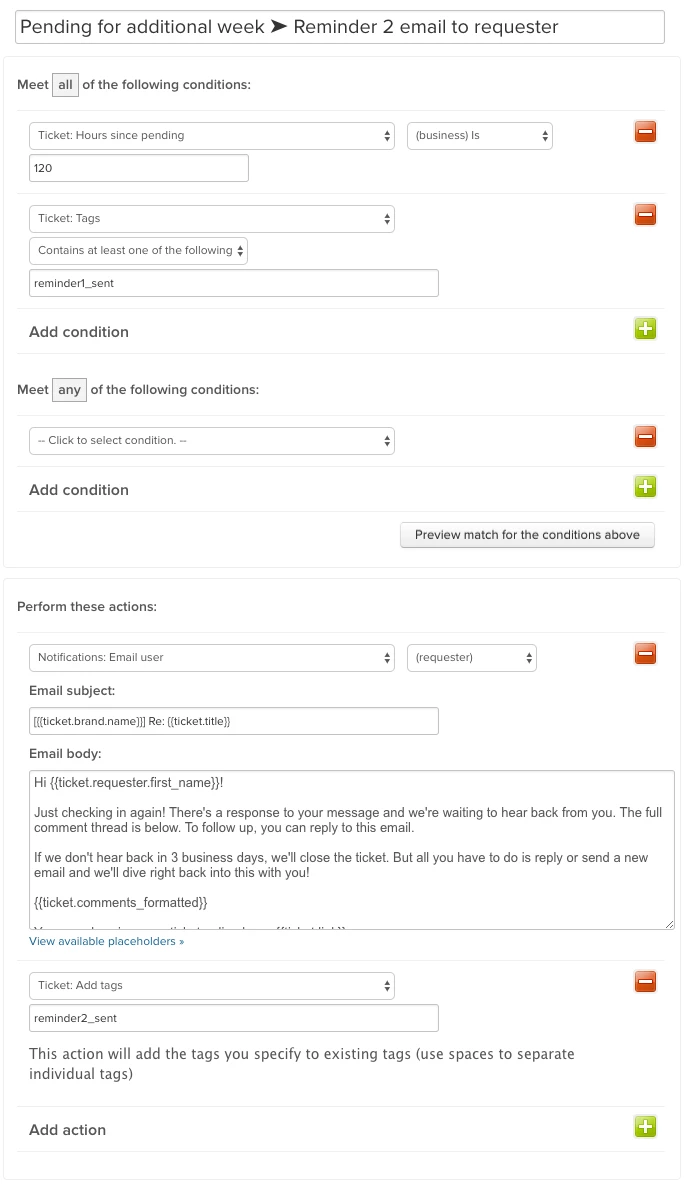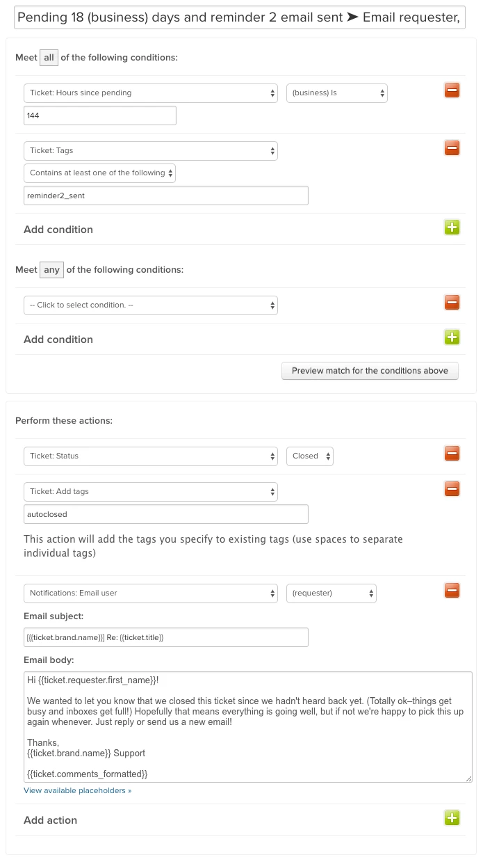 Automate sending emails to remind an end user you're waiting for them to answer, and if they never answer, close the ticket. Less manual updating for agents!