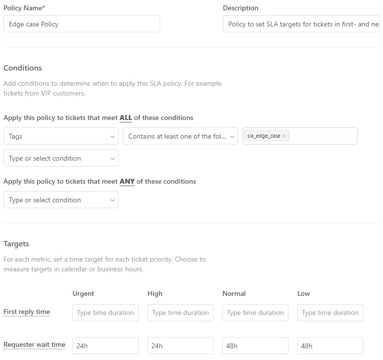 * Keep in mind that Requester Wait Time never resets, if a ticket is placed into the edge-case policy repeatedly, the time accumulates.