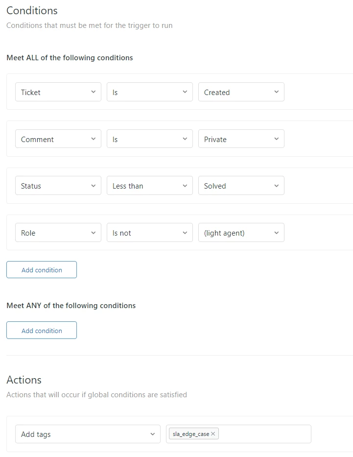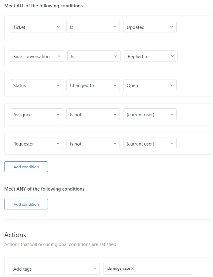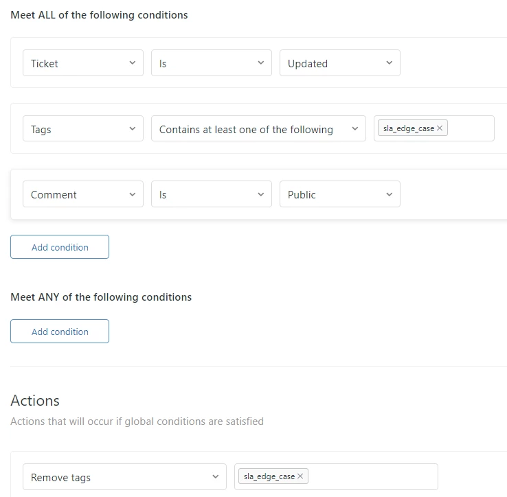 - A trigger to remove the edge-case tag whenever a public reply is added to the ticket, so the ticket enters into your standard SLA policy if the ticket returns to the support team.