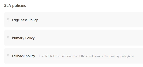 - Triggers that apply the edge-case SLA policy (indirectly by setting a tag) to tickets using conditions that hook into the events representing the edge-case.