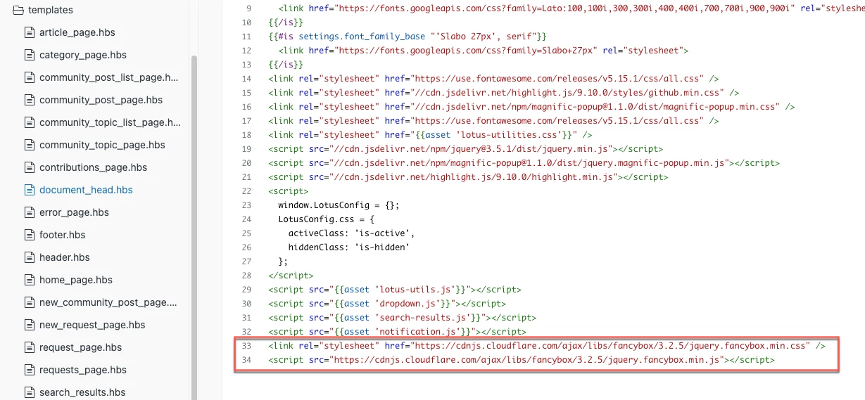 2. Add the links to the fancybox code in your document_head.hbs (the bottom of that file is fine):