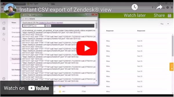 javascript:var win=window.open("","","width=600,height=500,scrollbars=yes");var vn=+window.location.href.replace(/(.*filters/)/,""); var w=win.document; w.write("<p style='font-family: Arial; color:black; margin:3; font-size: 12; align-text:right;'>Export view to CSV file <a href='http://app1.roundrobin-assignment.com/?utm_source=prs' target=' _blank'>Created by Round Robin App team</a> (<a href='https://twitter.com/RoundRobinApp' target=' _blank'>@RoundRobinApp</a>)</p><div style='background-color:#4C4F53; margin-bottom:15'><input type='text' id='fn' value='view"+vn+".csv' style='margin:4'><button type='button' onclick='mycl()'>Save</button></div>"); w.write("<script>function mycl(){var saveData = (function () { var a = document.createElement('a'); document.body.appendChild(a); a.style = 'display: none'; return function (data, fileName) { try{ var blob = new Blob([data], {type: 'octet/stream'}); var url = window.URL.createObjectURL(blob); a.href = url; a.download = fileName; a.click(); setTimeout(function(){window.URL.revokeObjectURL(url);}, 2000); } catch(e) {alert('Your browser does not support saving files created on the client side. Please use Copy and Paste.')} }; }());var data=document.getElementById('data').innerHTML;data=data.replace(/(<br.*>)/g,'');var fileName = document.getElementById('fn').value;saveData(data, fileName);}</script>");var url="/api/v2/views/"+vn+"/execute.json";var l=1;f(url);function ai(a, s, p){for(var i = 0, len = a.length; i < len; i++){if (a[i][p] === s) return i;} return -1;}; function gv(o, r, a){var v=o.rows[r][a]; if (typeof v == "undefined") {v=o.rows[r][a+"_id"];}; if (v !== null) {if(a=="assignee" || a=="requester"){return o.users[ai(o.users, v, "id")].name}; if (a=="group") {return o.groups[ai(o.groups, v, "id")].name};if (a=="organization"){return o.organizations[ai(o.organizations, v, "id")].name};if (a=="via"){return v.channel}; return v;} else {return ""};};function f(u){var xh=new XMLHttpRequest();xh.onreadystatechange=function() {var obj; if(xh.readyState==4&&xh.status==200){obj=JSON.parse(xh.responseText); w.write("<div id='data'style='font-family:Arial;font-size:14;'>"); var q=String.fromCharCode(34); var q1 =String.fromCharCode(39); var s="id,Description"; if (l == 1) {for (var j = 0; j < obj.columns.length; j++) { s += ","+q+obj.columns[j].title+q; }; l=0; w.write(s+String.fromCharCode(13,10)+"<br id=0>"); }; for (var i = 0; i < obj.rows.length; i++) {var s=obj.rows[i].ticket.id+","+q+obj.rows[i].ticket.description.replace(/[\r\n]/g," ").replace(/"/g, q1).replace(/\s+/g, " ")+q; for (var j = 0; j < obj.columns.length; j++) {s += ","+q+gv(obj,i,obj.columns[j].id).toString().replace(/[\r\n]/g," ").replace(/"/g, q1).replace(/\s+/g, " ")+q; }; w.write(s+String.fromCharCode(13,10)+"<br id=0>"); }; if(obj.next_page!==null){f(obj.next_page)}else{w.write("</div>")}; }; };xh.open("GET",u,true);xh.send();};