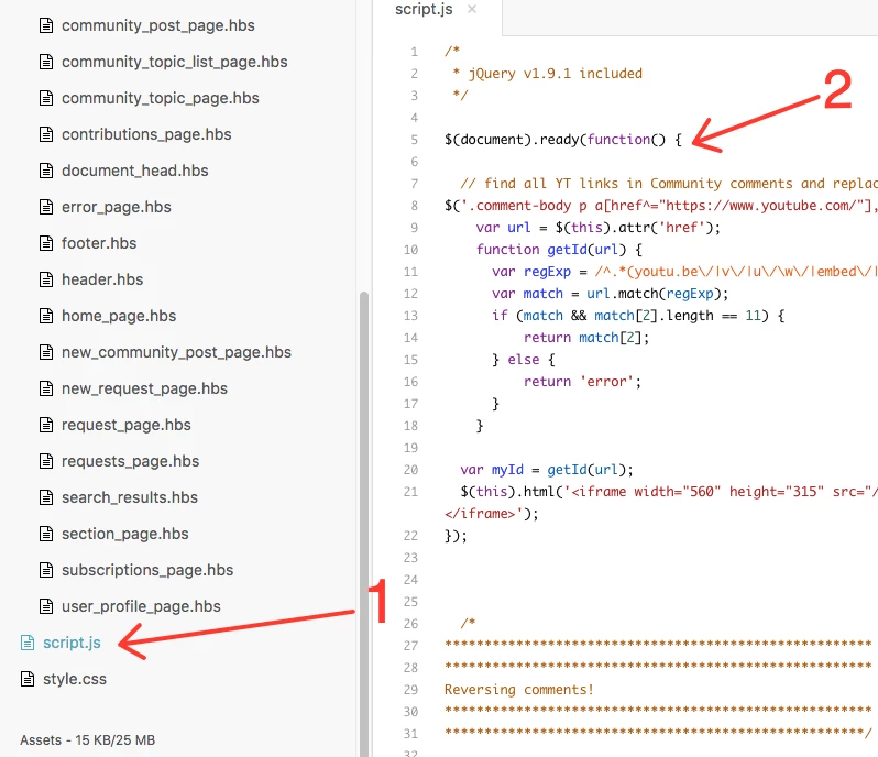 All you need to do is to paste the following code into your theme script file (1) after the start line of document.ready function (2), like in the image below: