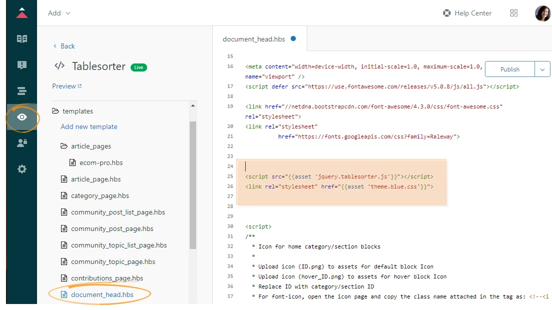 - Next you need to instruct Zendesk to use the tablesorter plug-in for all of your tables.