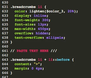 - We can add our snippet between any element on the CSS page. CSS doesn't care where you place your elements. But for hygiene sake, let's place the snippet near the existing breadcrumb elements. Find the line between the .breadcrumbs li element and the .breadcrumbs li + li::before element. See the example below.