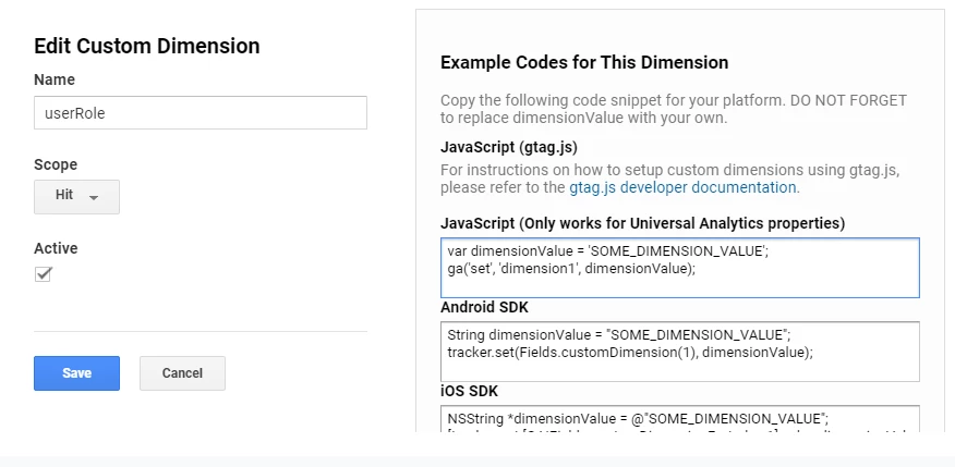 - name—The name for the custom dimension. Required. This is a string that identifies the custom dimension and appears in your reports. (dimension[0-9]+)
