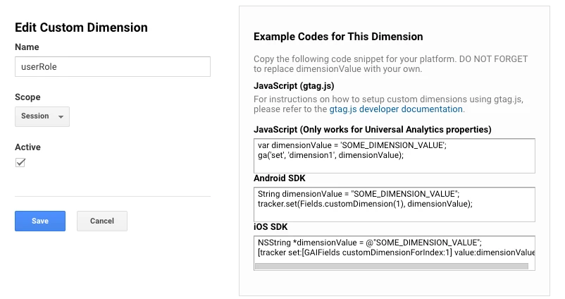 - Active – whether the custom dimension or metric value will be processed. Inactive custom dimensions may still appear in reporting, but their values will not be processed.