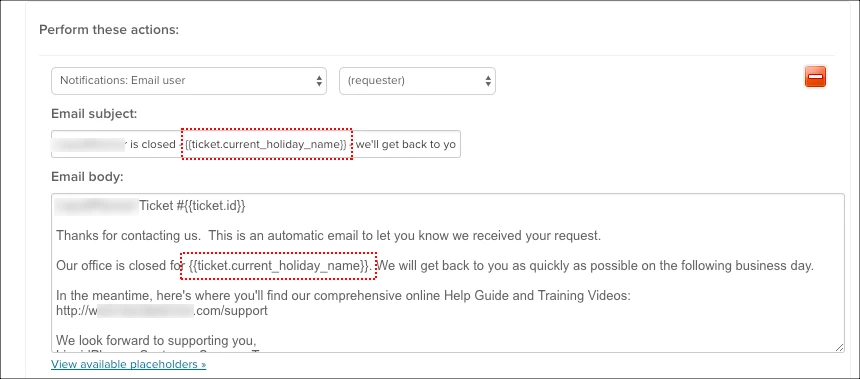 (3) Create one holiday trigger to be used for all holidays. That trigger must have the condition "Ticket: On a holiday?" and "Yes". You can also use a ticket field to insert the name and date of your holiday automatically.