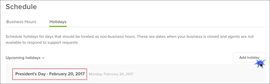 More detailed instructions in Zendesk article: Setting your schedule with business hours and holidays