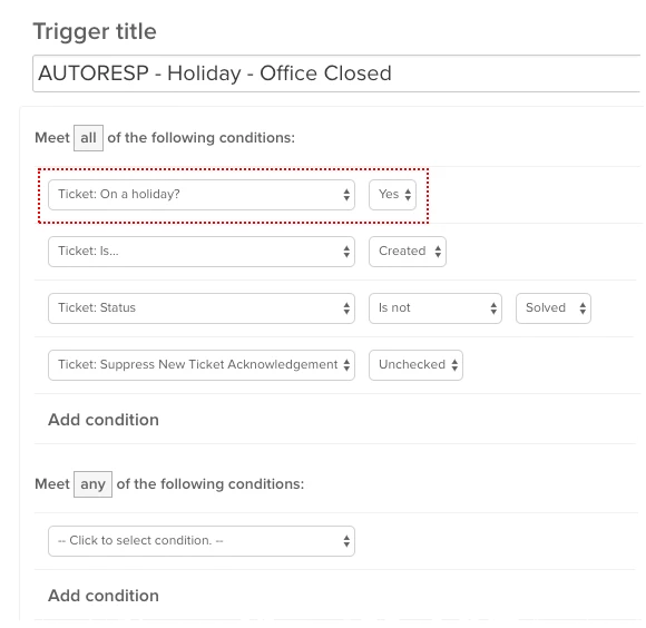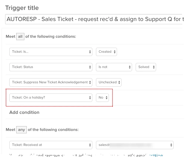 (2) Edit your existing triggers to show that they should be used other than when it's a holiday - by adding the condition "Ticket: On a holiday?" and "No". Looks like this: