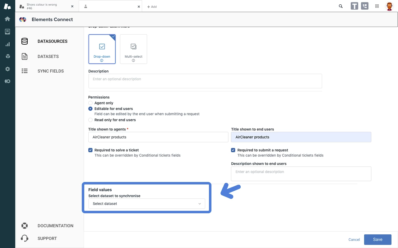 You have the data you need, now you just need to set it as the ticket values. You can display the data in a pre-existing Zendesk field, or create a new one. To make the field available for customers on the support request form, under Permissions, select the option Editable for end-users: the field will appear in tickets and in the support request form in Help Center. Then select the dataset you prepared to synchronize the ticket values.
