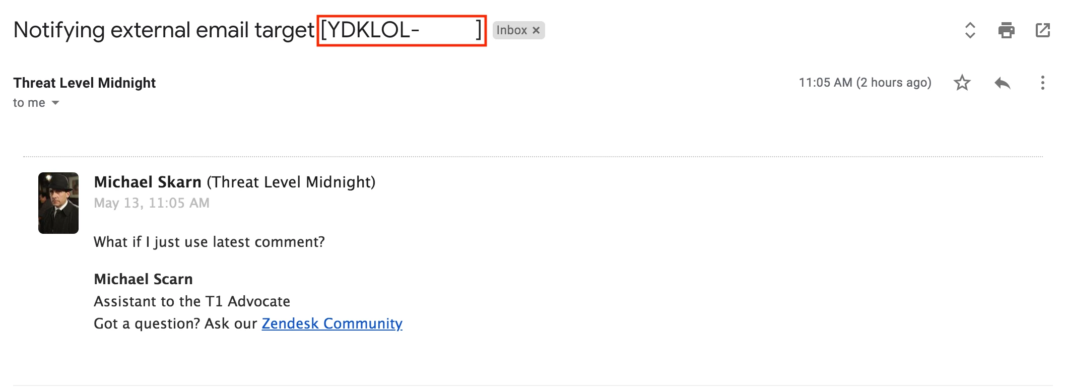 Note: Because the external user replying to the target notification is not CC'd to the ticket, their response would be added as an Internal Note. For the response to be public you would need to CC the target recipient.