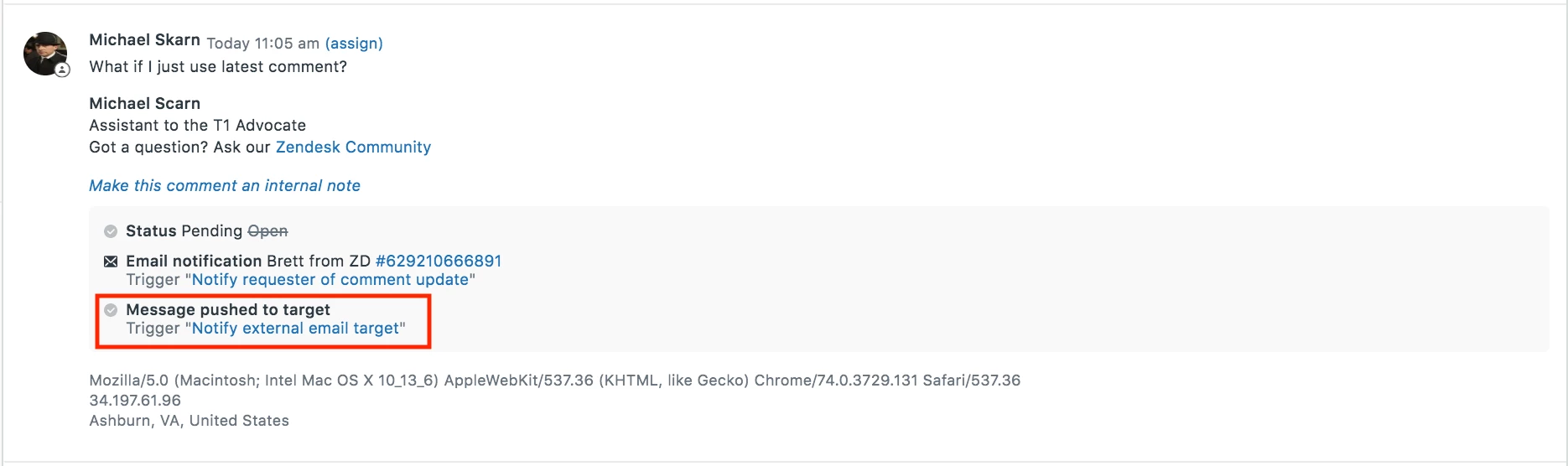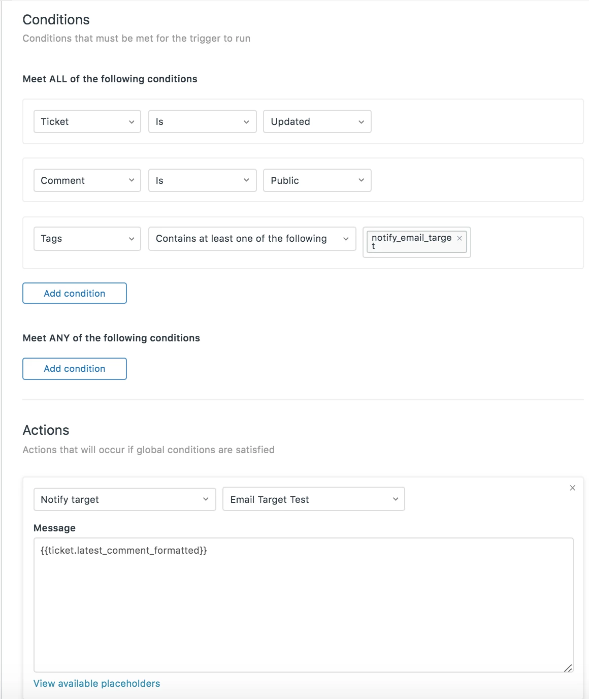 Based on the conditions configured above, you will need to update your ticket with a public comment and add the notify_email_target tag.