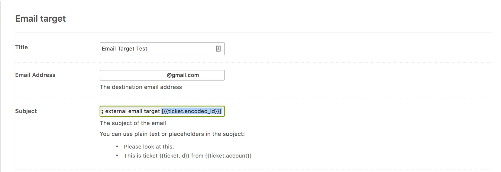 - Subject (The subject of your email you’d like to send followed by [{{ticket.encoded_id}}] . Be sure to include brackets on both sides of placeholder.)