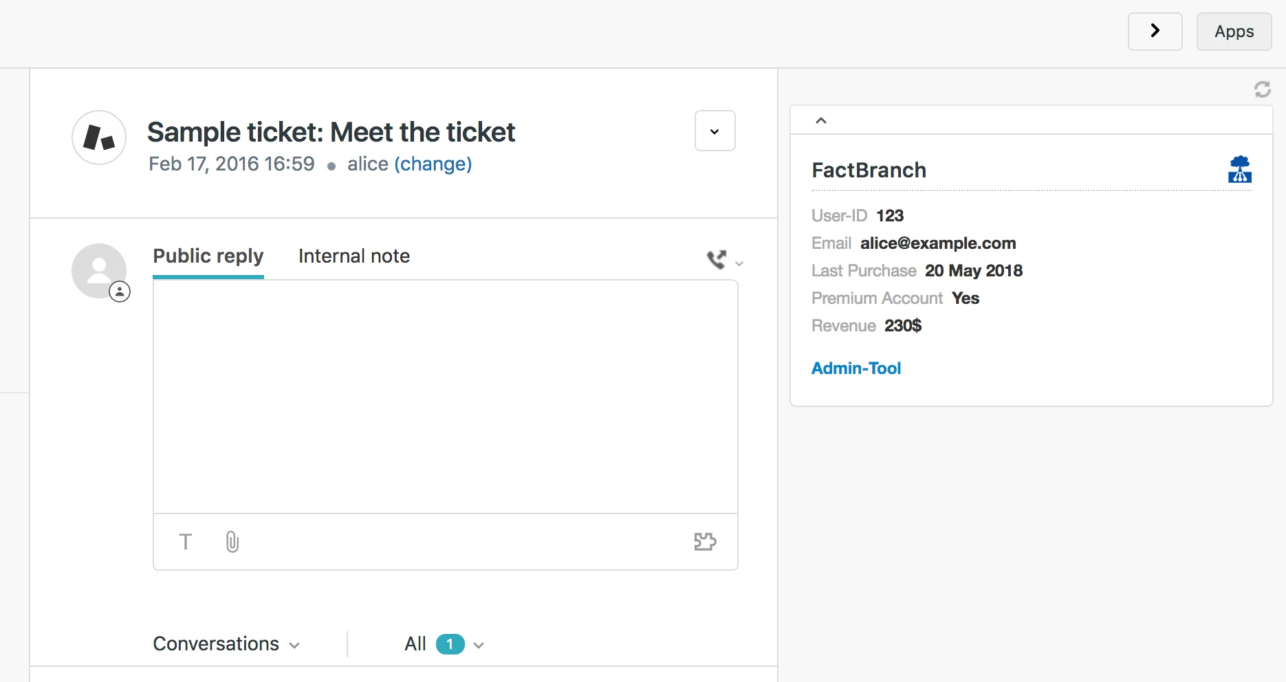 Now when you open a ticket, FactBranch looks up the customer in your spreadsheet and displays their data in the ticket sidebar.