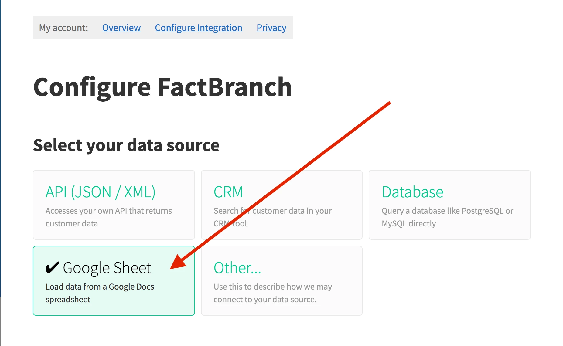 Go to My Account > Configure Integration and select Google Sheet as your data source.