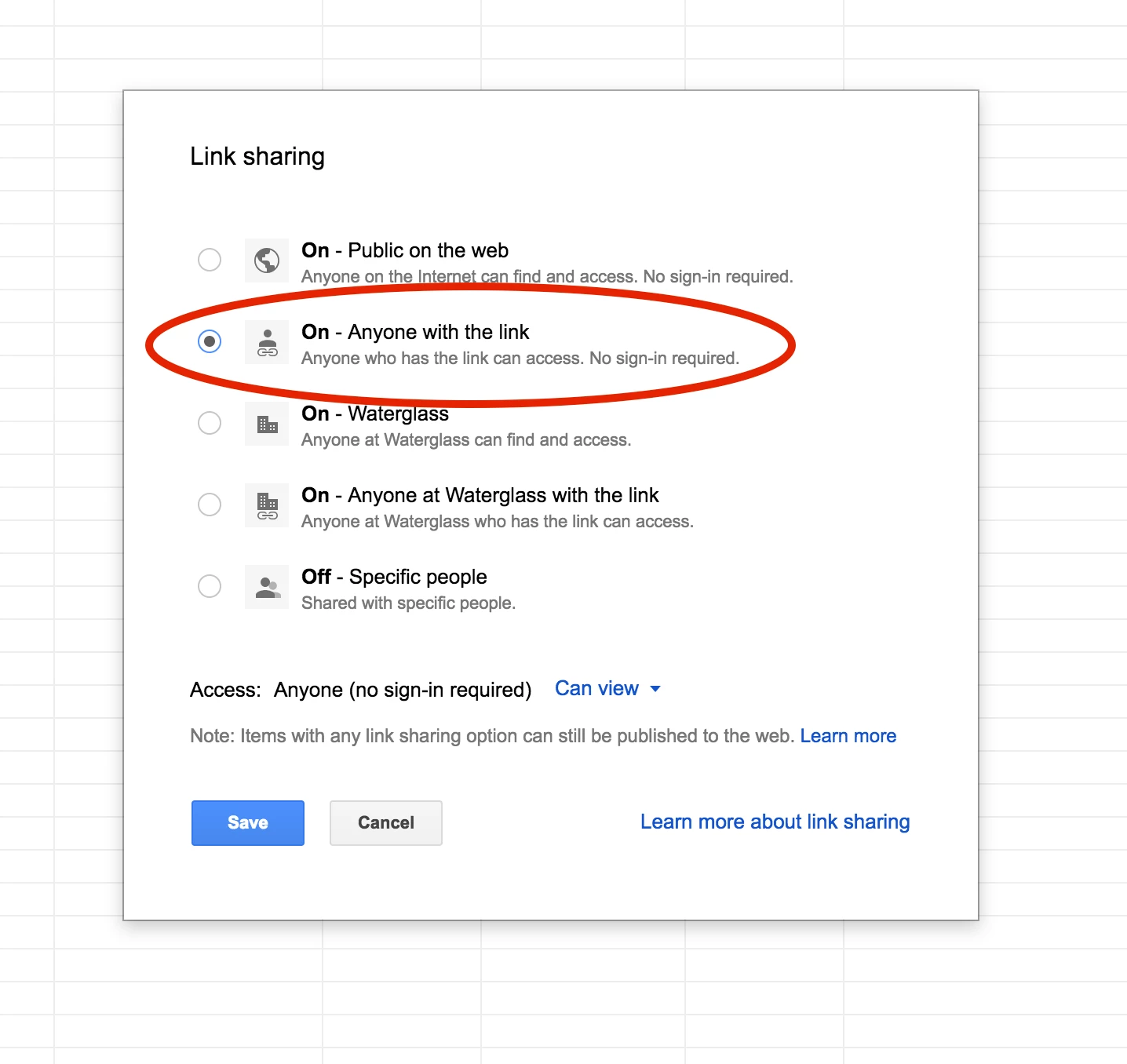 Now select On - Anyone with the link. This allows the app to access the spreadsheet.