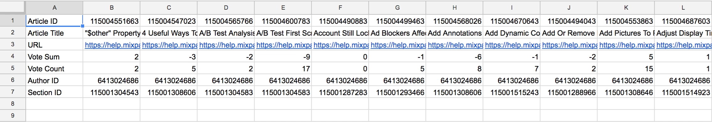 This tool uses the Zendesk Help Center API(https://developer.zendesk.com/rest_api/docs/help_center/introduction) to pull Guide Information and populate it in a csv file. This will output values such as Article Id, Article Title, and Vote Count.