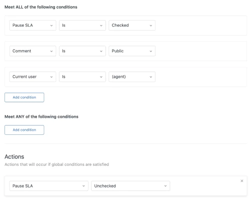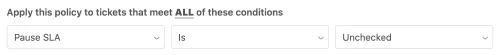 Add a condition to all SLA policies that you’d like to use this functionality on so that the SLA is only applied for tickets in which this checkbox is unchecked.