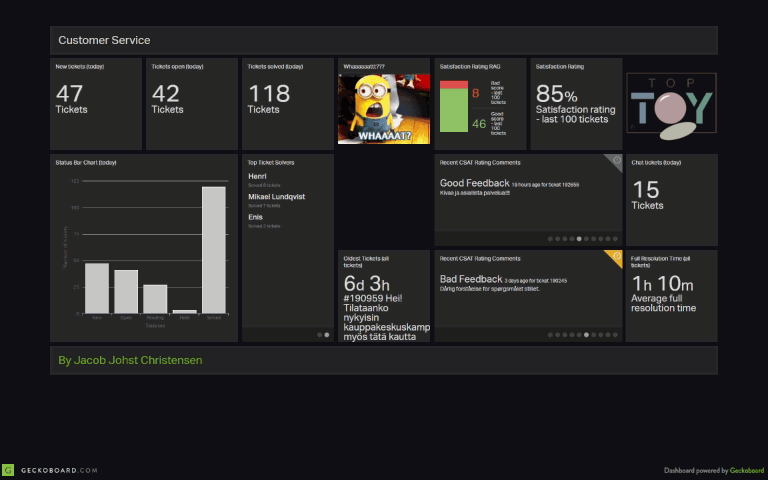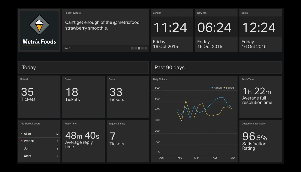Zendesk note: See Jacob's comment below for his review of Geckoboard. Please share your thoughts/experiences/reviews of operational dashboards.