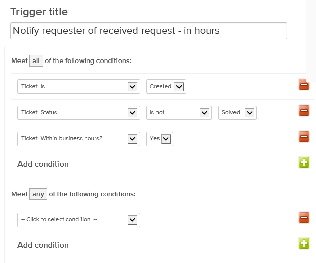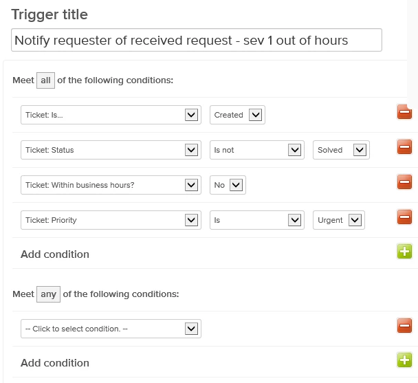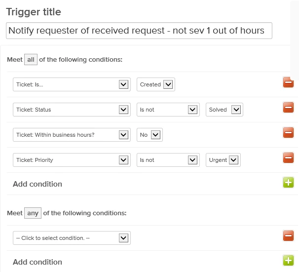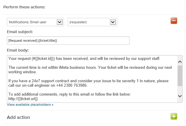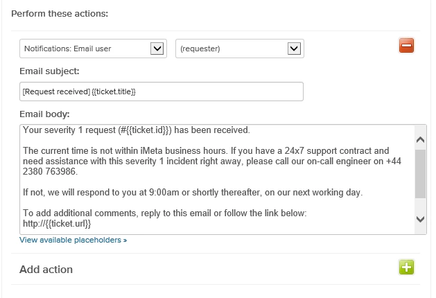 We saw that much of this could be addressed by changing the wording in the initial e-mail that would be sent to the customer via the trigger “Notify requester of received request”, however we did not want to overly complicate the message to a customer. We did not want to encourage them to call us outside of our business hours if the problem was not critical in nature and we wanted to try to make our operating hours clearer in their time zone.