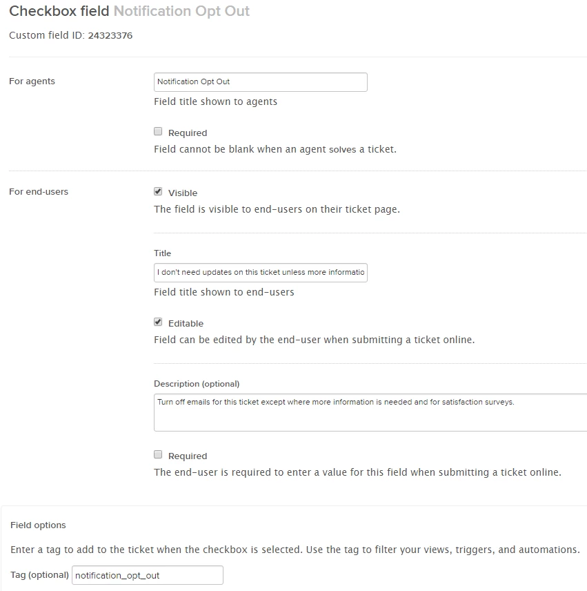 - Create a custom Notification Opt Out checkbox ticket field and add it to any applicable ticket forms
