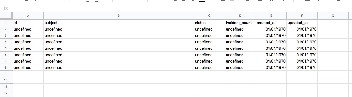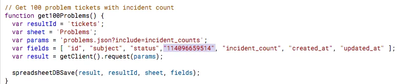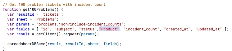 Now that we are all set, give it a go by selecting Zendesk > Get Problems; this will populate the Problems sheet with all of your current unsolved problem tickets and their information, including incident counts.