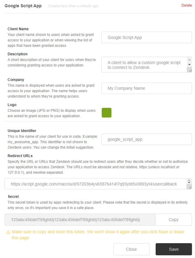 - Save your new client and copy the Secret that appears and head back to the spreadsheet.