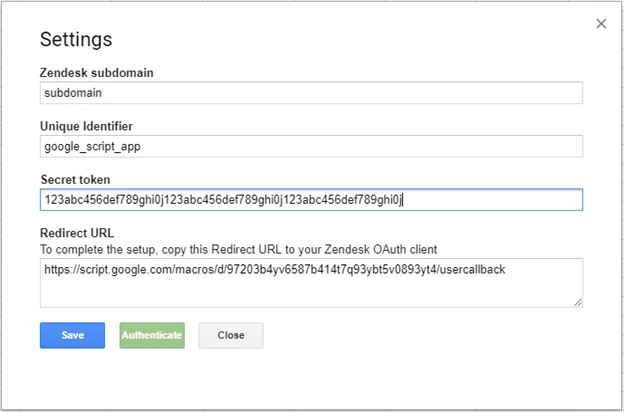 Hint: The spreadsheet will automatically prompt you for Authentication if you try and run any of the functions from within the Zendesk menu.