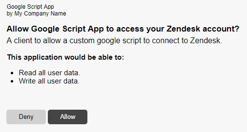 If you have yet to authorise the script to run on your Google Drive you will need to before you connect it Zendesk.