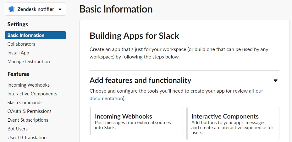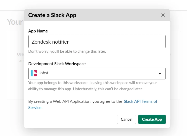 Give the app a name that is appropriate, I've chosen Zendesk notifier for this example, and also select which Slack Workspace you want the notifications on (if you have multiple).