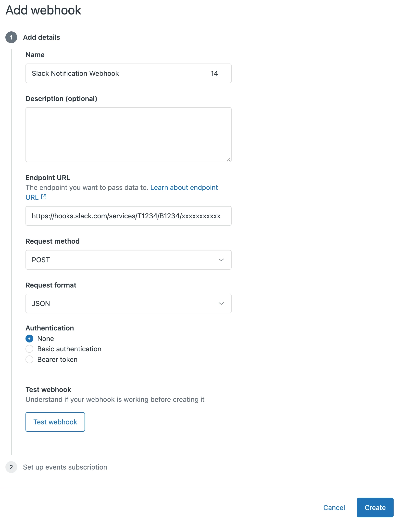 - The Endpoint URL which is your Slack Webhook URL from earlier