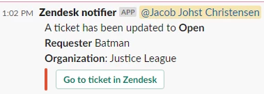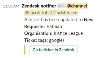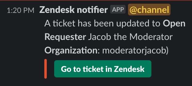In the example here, I include an @channel mention, followed by a four-paragraph message stating that there is a ticket has been updated to its current status, there is a button linking to the ticket in Zendesk (for easy access), and the requester name and organization name are also included. There is also a timestamp from the ticket update included.