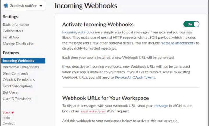 Switch on the incoming webhook and click the Add new webhook to Workspace link