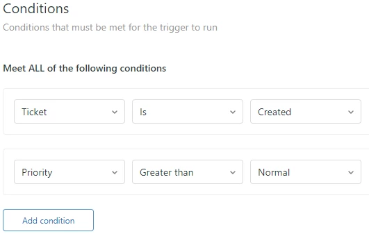 Below I set the trigger to fire when a ticket with a priority above Normal is created.
