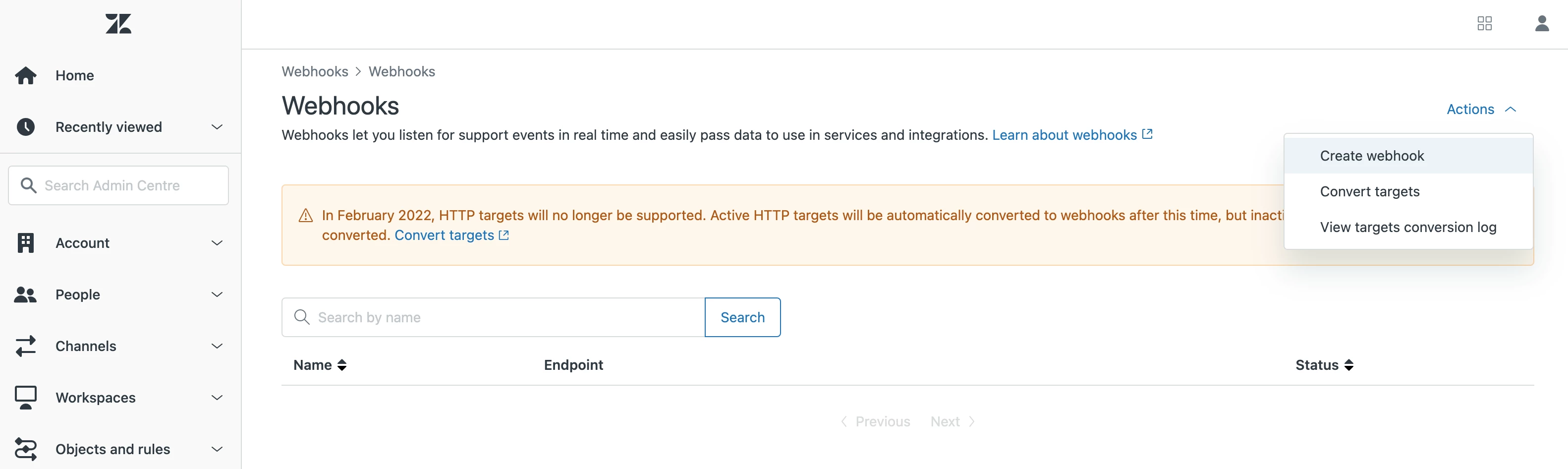 Navigate to the Webooks page: Admin Center > Apps and Integrations > Webhooks, and click Actions > Create Webhook.